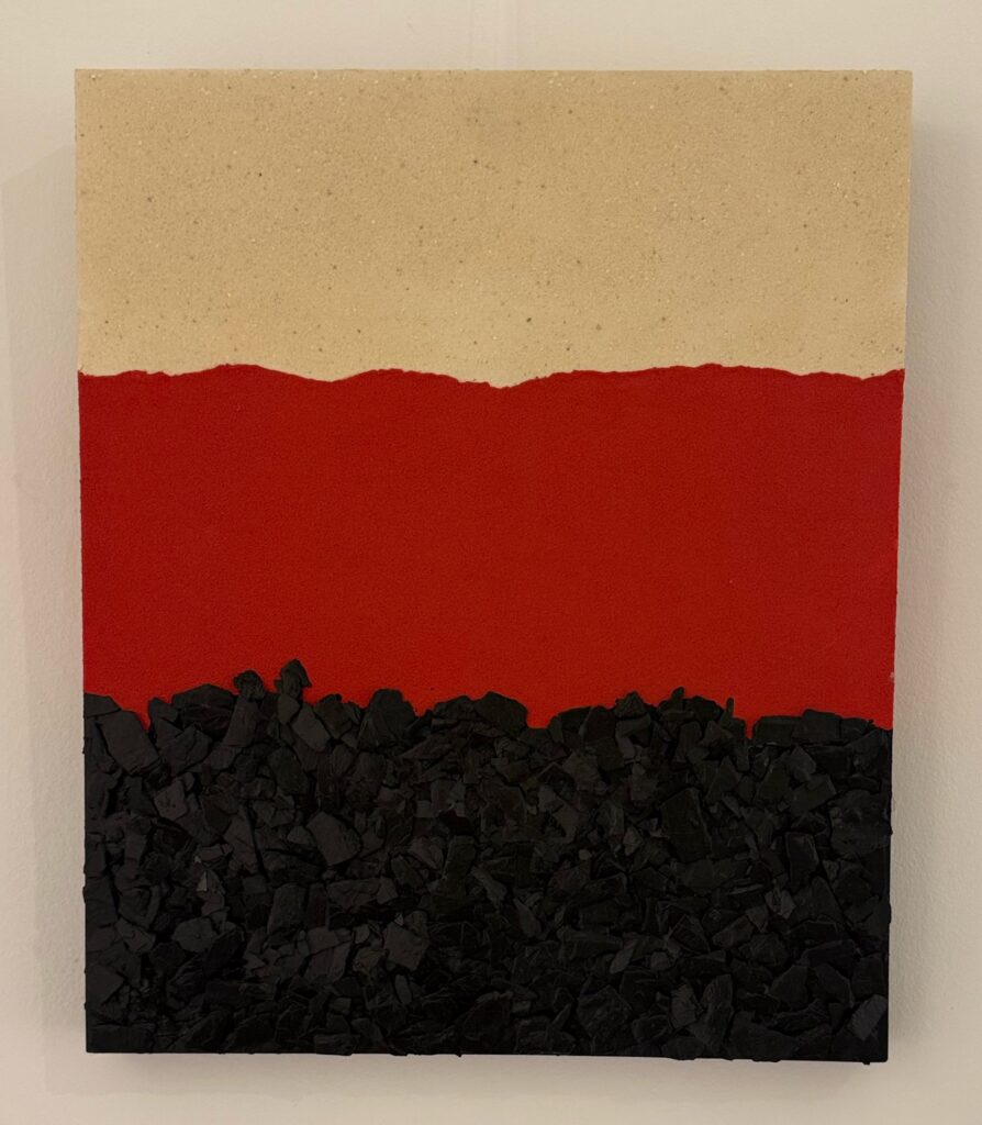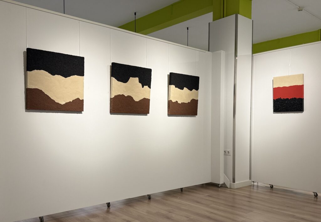 Diego Arribas compone paisajes hechos con polvo de alabastro, óxido de hierro, pizarras y otros minerales. Con ellos crea superficies y estratos que parecen extraídos directamente del subsuelo aragonés. Sus obras son fragmentos de un tiempo profundo: mapas geológicos convertidos en relato visual, territorios detenidos que nos trasladan el ritmo del latido de la tierra.